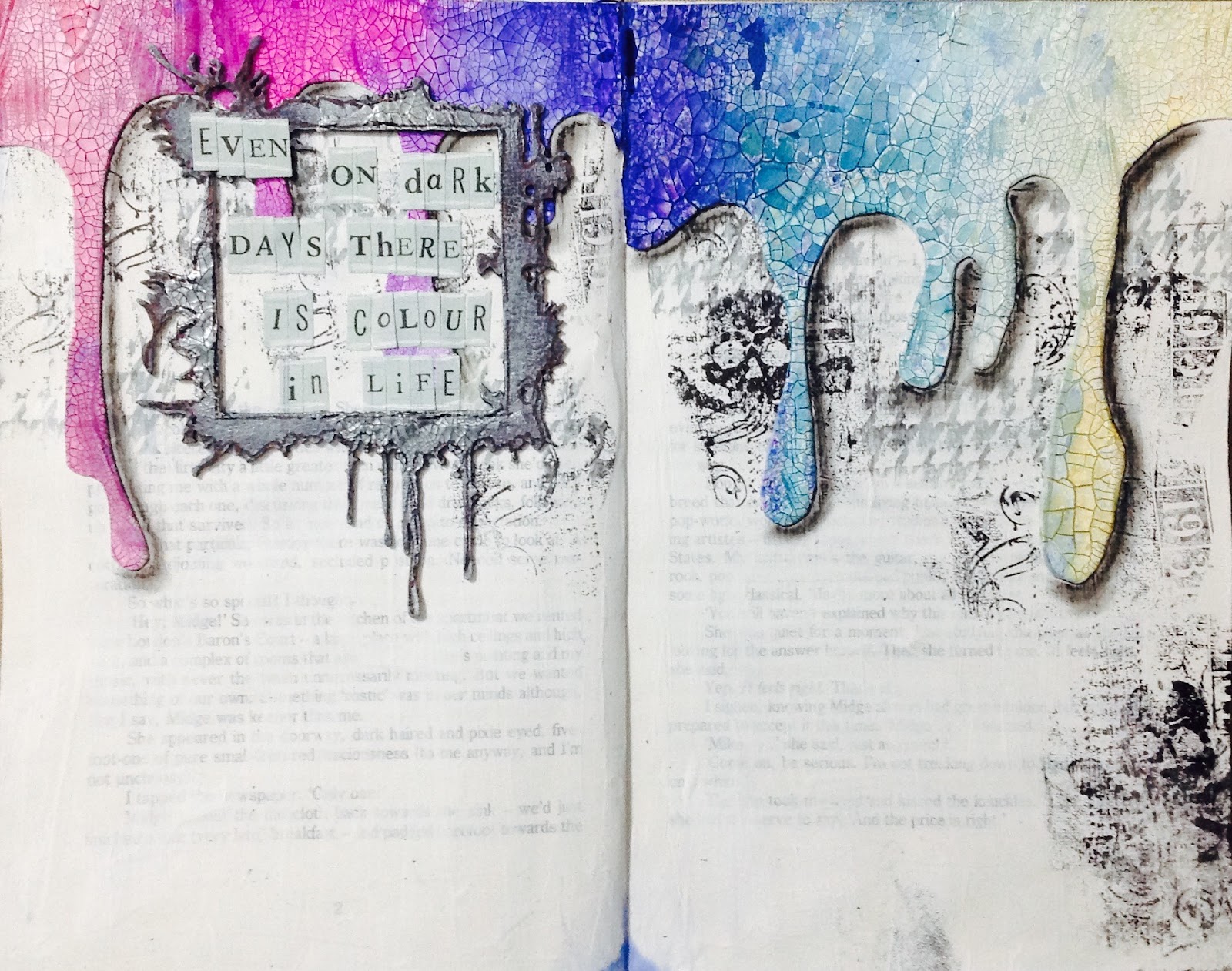 Stencils, modelling paste, inks, paints, sprays, chipboard, papier-mache, grit, wires and ephemera all went into this vision of decay and rebirth.
