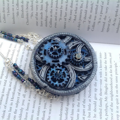 This necklace has been handmade from polymer clay, swarovksi crystals, acrylic paints and die cut gears. The astrolarium piece itself measures approximately 6.5 cm across and the entire chain plus pendant measures approximately 56cm in total length. The pendant is attached to a silver style chain with a toggle fastening. If you like this piece, you can purchase it here.