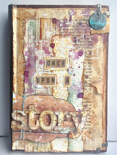 Sometimes, I admit, I find inspirational quotes a bit twee and overused. The words in my life that mean the most to me have come from the pages of books, stories that have stayed in my head for years and still have the power to move me and make me think, even after many years or re-reading the same pages many times. So I've made a mixed media journal where I can record these words and stories, where I can put pictures and images to the words in my head. This is the cover for this journal: