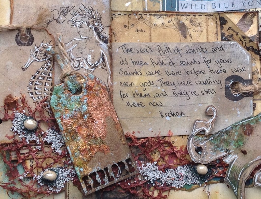 The quote on the journal page below is from one of my favourite stories, Kraken by China Mieville. Here, the Kraken are ancient gods, worshipped by a cephalopodic cult in an alternative London landscape. The papers and tags are from 7dots Destination Unknown collection, with some netting, pearls and metallic foils and paints, plus some texture stones.