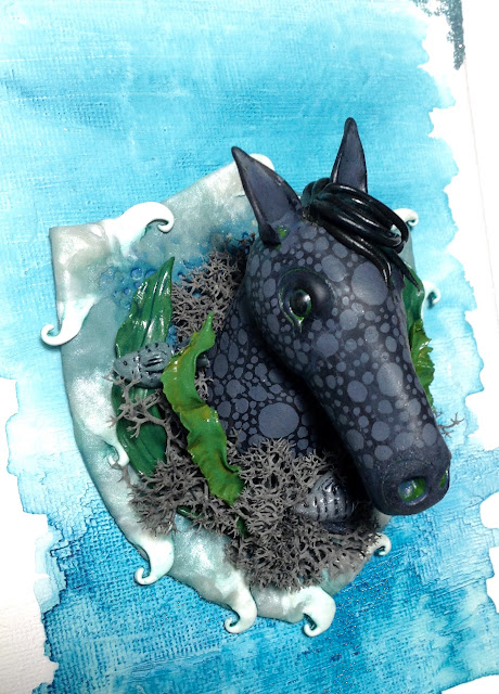 These canvases have been created using polymer clay to sculpt the figures and background plaques and decorated with acrylic paints, sprays and various mixed media components.