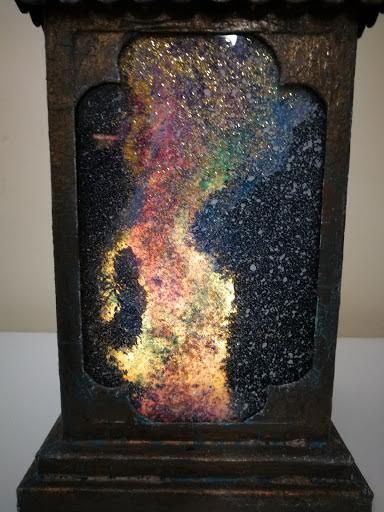 Now to finish the galaxy effect. Over the areas of colour I painted a very light layer of white gesso and over the rest of the glass I painted a thicker layer of black gesso (the reason why will soon become clear!), and when this was dry I put the glass panels back into the lantern.