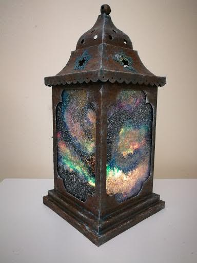 This is the finished lantern, with a shabby, vintage-effect frame and beautiful galaxy panels, which looks pretty enough. But, if you place a candle or light source inside the lantern and dim the lights a little........