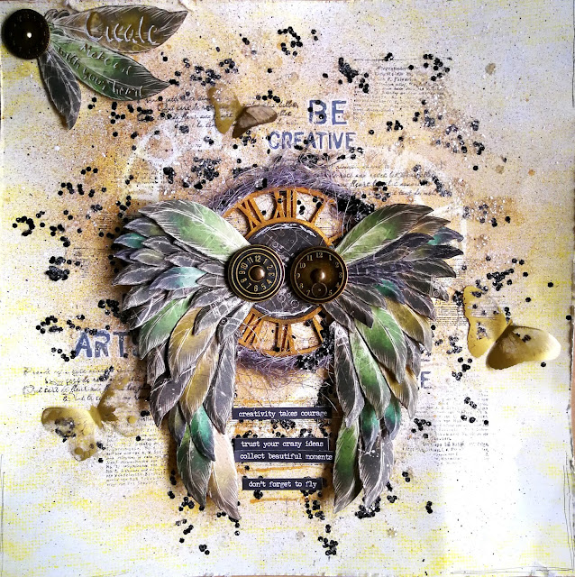 Ah, my poor neglected blog! I have not one but two projects to share that I created for 13arts. My July project can be seen here with a full product list. The His & Hers paper range has some beautiful feather designs on it and they always make me think of wings, so that's exactly what I made with them!