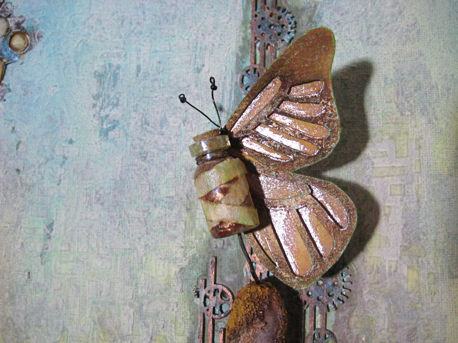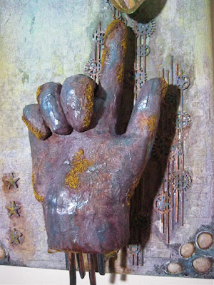 Stencils, modelling paste, inks, paints, sprays, chipboard, papier-mache, grit, wires and ephemera all went into this vision of decay and rebirth.