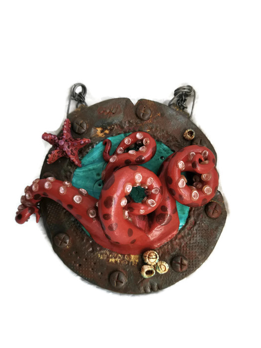 Using an old picture frame as the base, I built up the ship first using sculpey and then added the kracken around it. Acrylic paint, metallic waxes and gloss varnish were used to create the details. I'm so happy with how this turned out and even more thrilled that my craft exchange partner loved it too.