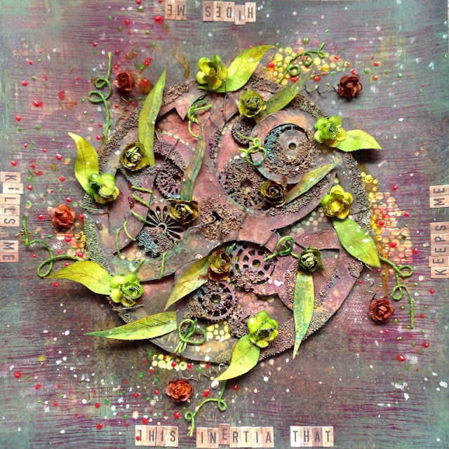 Created using lots of paints, sprays, diecut cogs, flowers and a lot of mess!